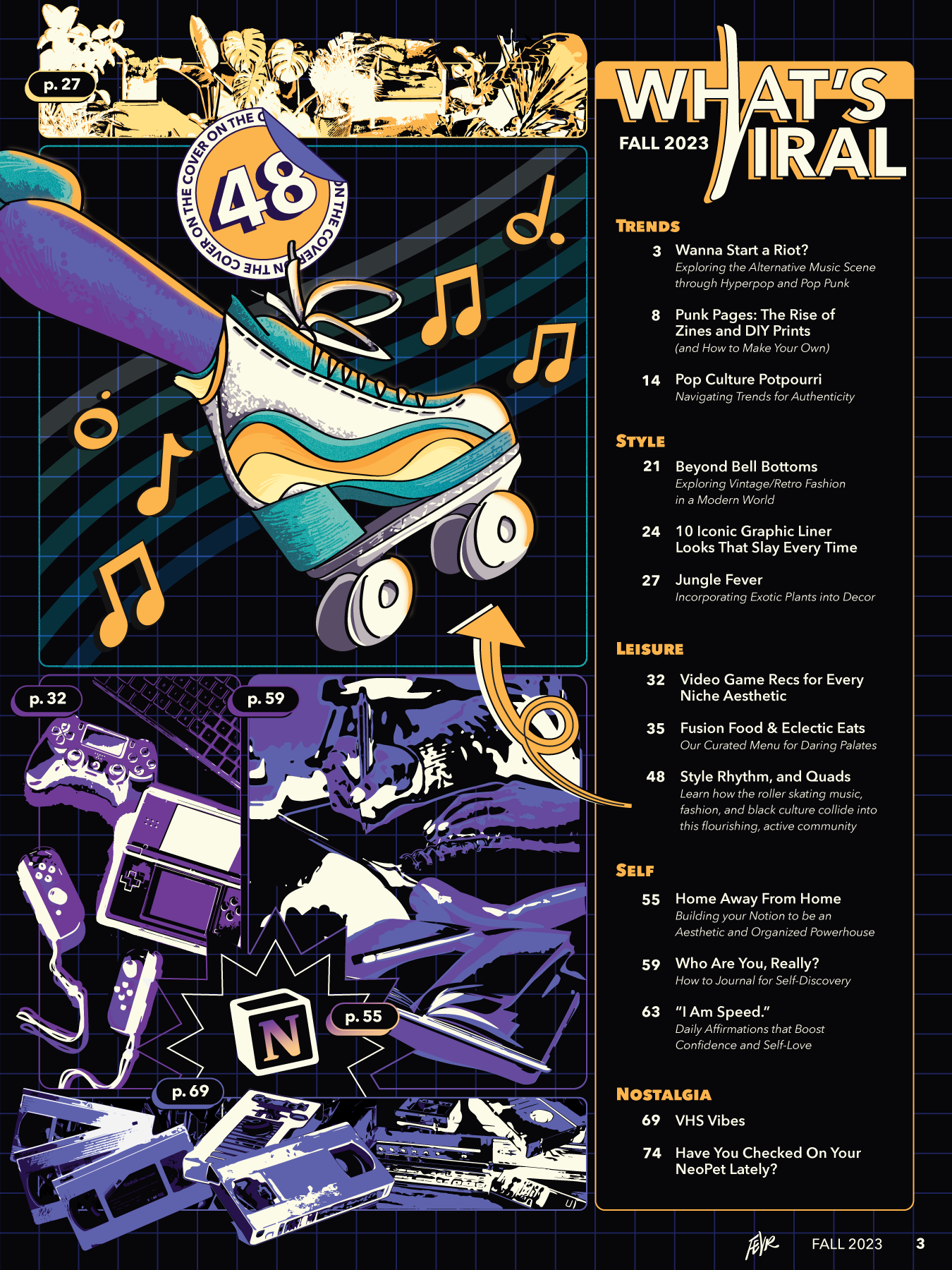 In response to the isolating impact of the global pandemic, I developed Fevr Magazine, a fictional magazine concept that celebrates all things retro, eclectic, and niche. Fevr Magazine seeks to reignite the desire for real-world connections and genuine experiences within the post-pandemic landscape where online interactions dominate. Embracing the duality of my love for retro aesthetics and contemporary subcultures, the first issue of Fevr Magazine delves into the booming resurgence of roller skating, exploring its history intertwined with Black culture and music. In an ode to the magazine's eclectic theme, I curated ads for Polaroid and Depop, encapsulating the essence of the audiences and subcultures embraced by Fevr.
